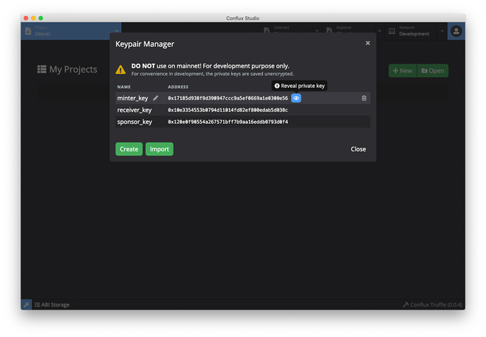 在 Conflux Studio 的任意界面,点击应用左下⻆的钥匙图标,打开密钥管理器。点击 Create 按钮打开新钥匙对弹窗,输入钥匙对的名字并点击 Save 按钮。完成后将在密钥管理器中看到刚刚生成的钥匙对的地址。钥匙对由私钥和公钥组成,公钥在智能合约中也常被称作地址。