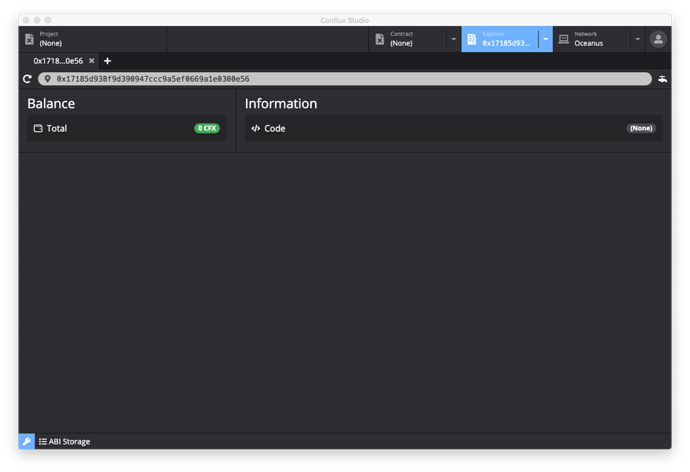 在部署合约前,首先需要确认在 Explorer 中选择合约部署所使用的地址,Conflux Studio 会使用这个地址将部署合约这笔交易进行签名(选择的方法为在 Explorer 的地址栏中输入地址)。在合约代码的 constructor 中,minter 被赋值为 msg.sender,这个 msg.sender 就是 Explorer 所选择的地址。
