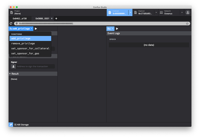 在 Conflux Studio 中访问 contract_addr 合约,选择 add_privilege 方法: