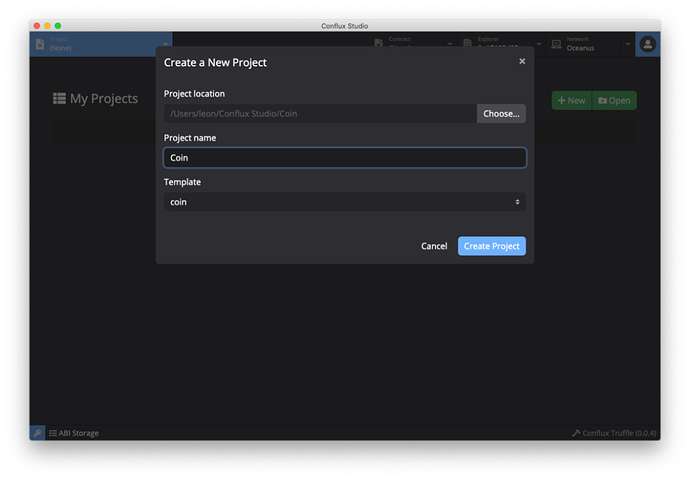 点击顶部左边的 Project 标签切换至项目列表页面,点击页面中的 New 按钮打开项目创建窗口,输入项目的名称并选择 coin 模版,点击 Create Project 完成项目的创建。