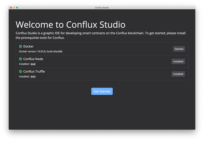 正确安装 Conflux Studio 并初次启动后,Conflux Studio 将显示欢迎页面,根据提示完成 Docker, Conflux Node 以及 Conflux Truffle 的下载、安装及启动。
