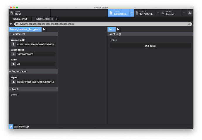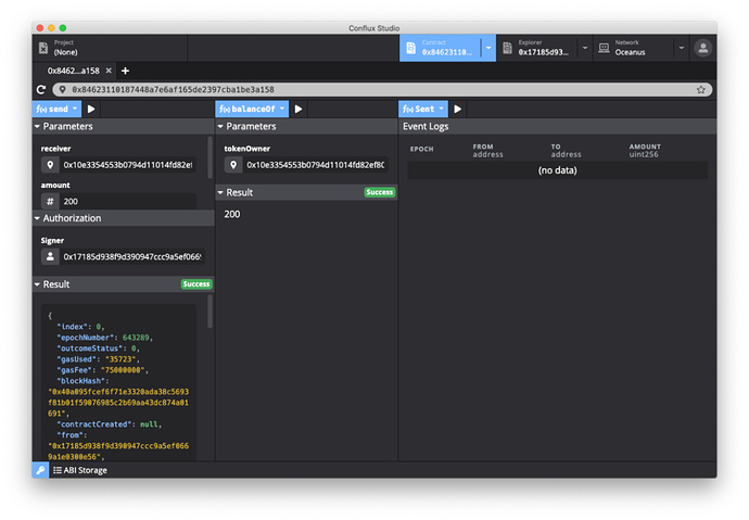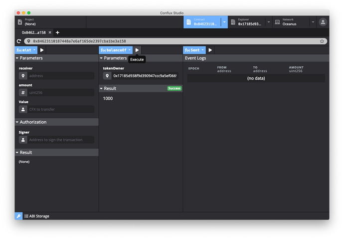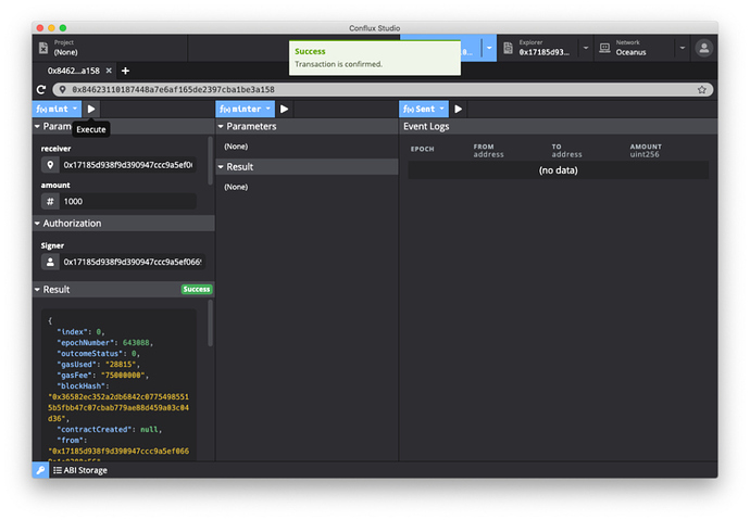 填写完成后点击执行按钮,Conflux Studio 将自动构造交易并推送到网络中。成功执行后可以在下方 Result 中看到这笔成功的交易。