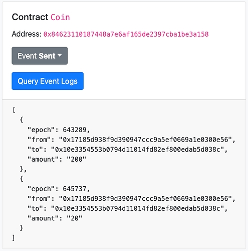 在事件区域选择 Sent 并点击执行,下方的 Event Logs 可以看到转账的记录。Sent 事件的列都是由代码中的 Sent 事件的参数来定义的(其中 epoch 为事件发生的时间,这个为系统默认列)。在代码中定义了 Sent 方法的参数为 from, to 和 amount,分别对应了这笔转账的发起者地址,接受者地址以及转账的数量。