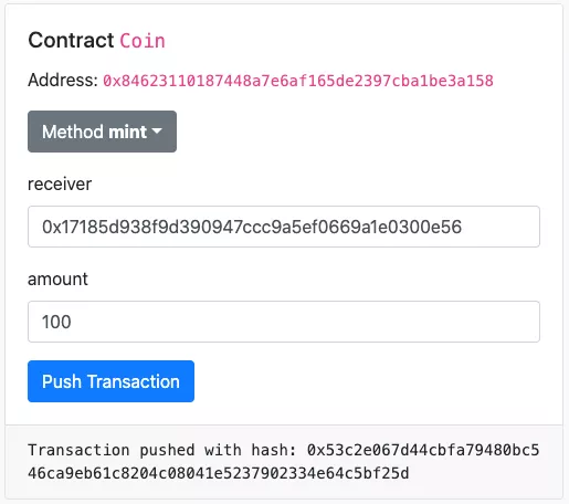 左下角的组件为 Coin 合约组件,可以通过这个组件调用代币增发和代币转账功能。