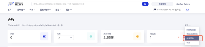 在测试网环境中,CFX 代币可以通过测试网水龙头获取(Conflux Studio 中均有入口,也可以使用测试网水龙头DApp进行获取)。在主网(Conflux Tethys中)中除了可以自行设置代付外,还可以在Conflux Scan的赞助合约页面页面向Conflux基金会申请,由Conflux基金会为合约代付。