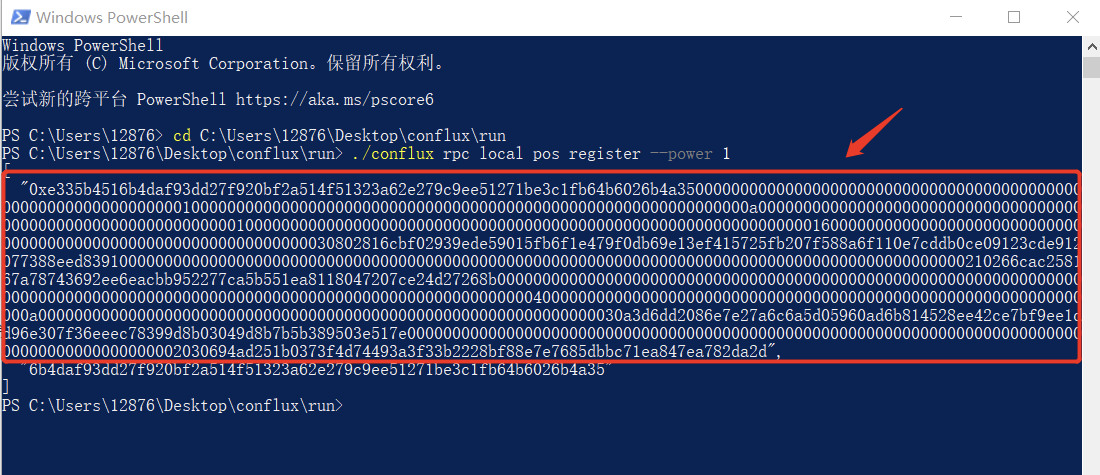 命令行返回值的第一项为注册PoS需要的data字段,第二项为PoS地址。