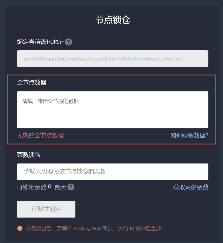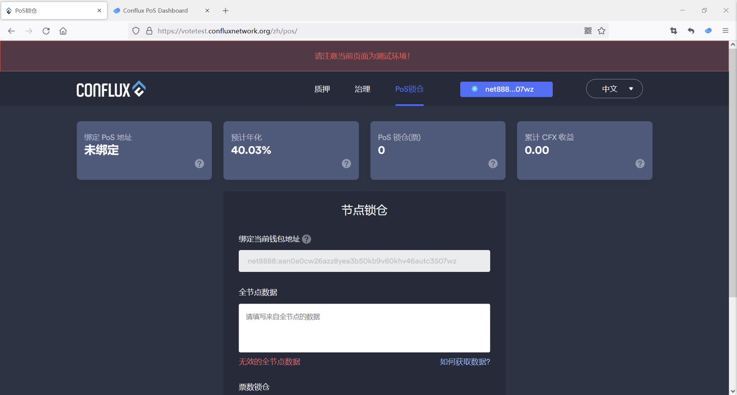 在“全节点数据”中粘贴填入上述data字段,选择锁仓票数(1000CFX算1票),点击“注册并锁定”,并在portal中确认。