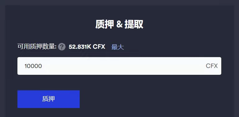 在当前页面填写质押CFX的数量(至少1000个),并点击“质押”按钮,质押需要进行portal确认。